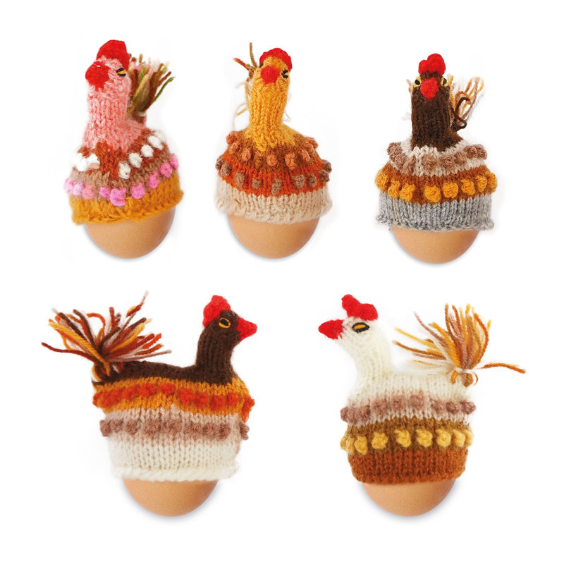 Hand knitted egg-cosy. The chickens come assorted in a variety of natural tones. There are over 15 different egg-cosies available. Each one bright and shiny at the table!