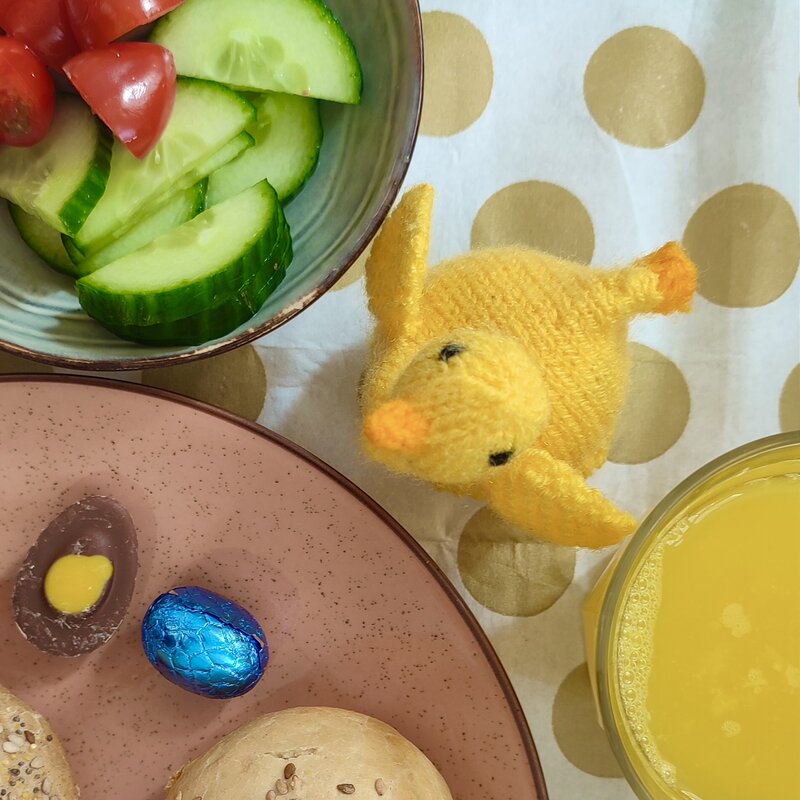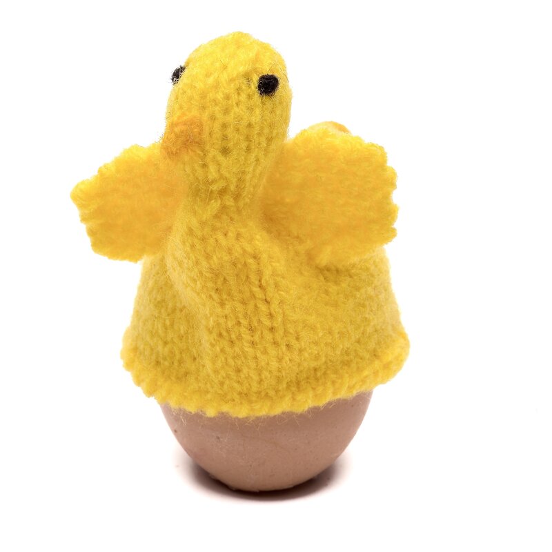 Hand knitted egg-cosy. Lovely yellow chick. There are over 15 different egg-cosies available. Each one bright and shiny at the table!