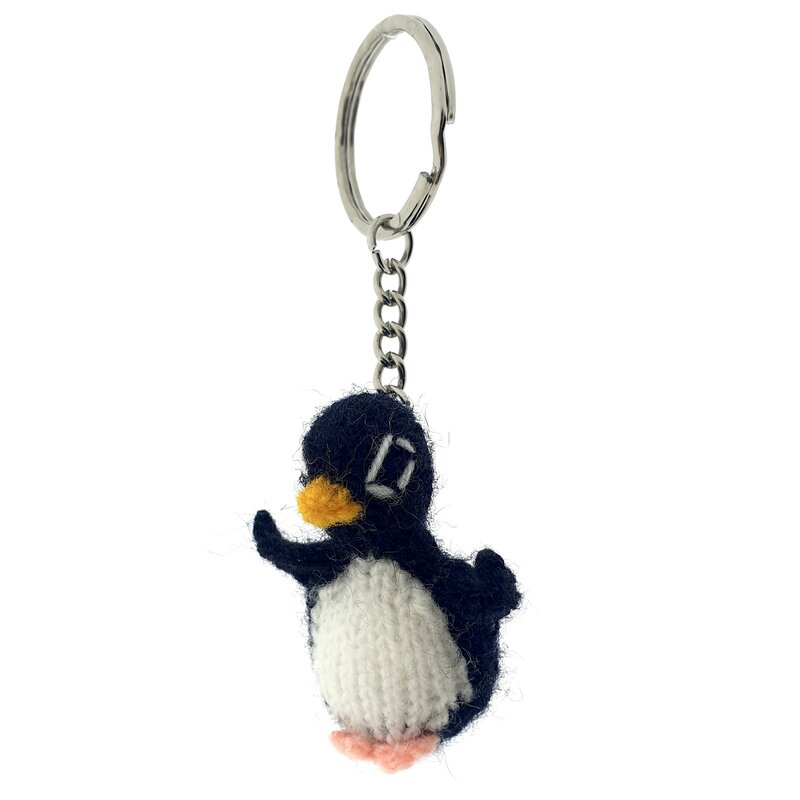 Beautiful knitted penguin, provided with a strong key ring. Solid and fun at the same time; beautifully handcrafted! All our knitting work is in the hands of dedicated knitters. Most knit as an activity beside their daily work. There are housewives with some time to spare, farmers between the sowing and harvest season, and shepherdesses who can knit a small penguin while they are herding the sheep and the lamas. The finger puppets and the other puppets provide them with a welcomed addition to their income.