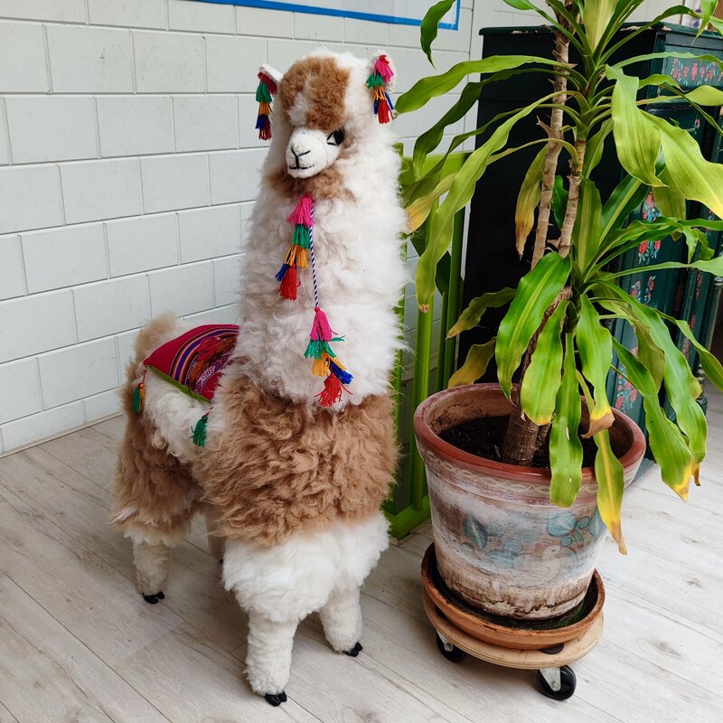 This impressive lama is made entirely of authentic llama wool. With its friendly appearance, full coat, and stately size, it effortlessly steals the show, whether it's displayed as a show-stopper in a shop or given a special place in a child's room or business premises.