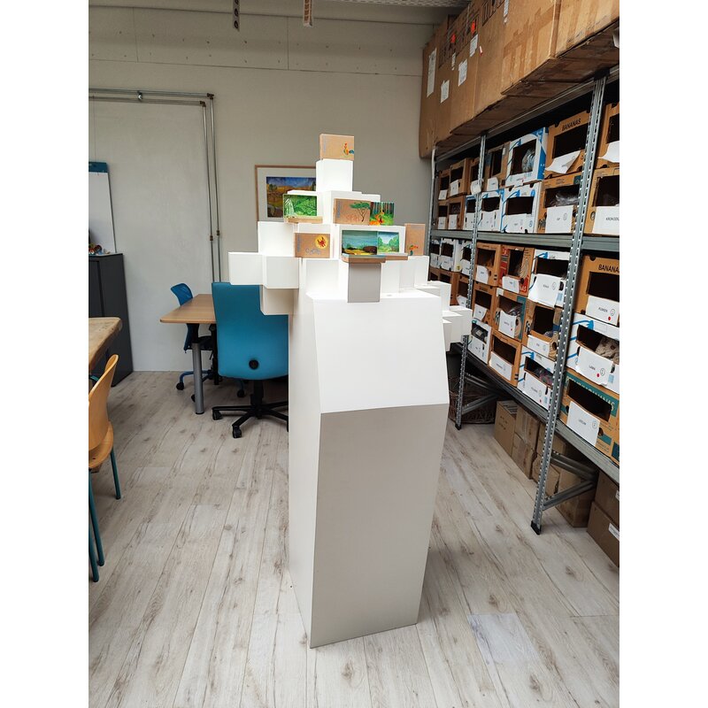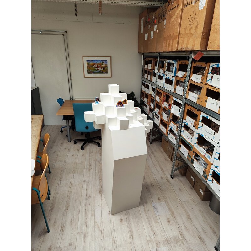 Uniek handgemaakt presentatiedecor van wit gelakt hout. Rustig, vrijstaand en perfect voor het tonen van kleine producten. Een echte eyecatcher voor een frisse winkeluitstraling.