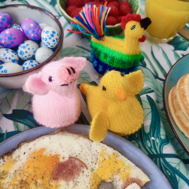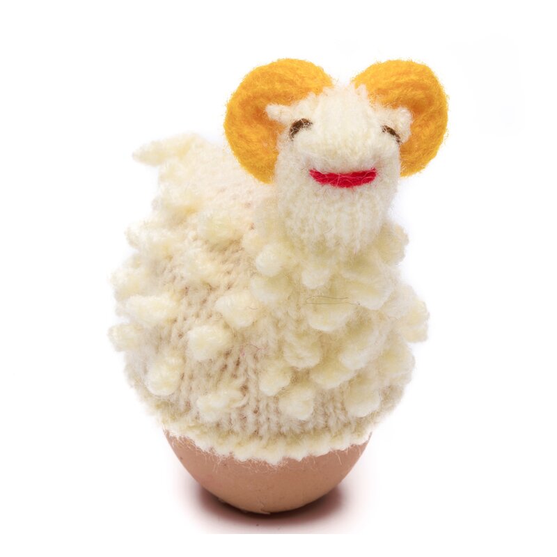 Handgebreide eiwarmer. Er zijn nog meer dan 14 andere soorten eiwarmers verkrijgbaar; stuk voor stuk opgewekte sfeermakers voor op tafel!
