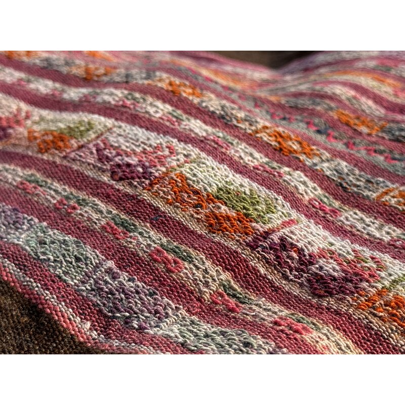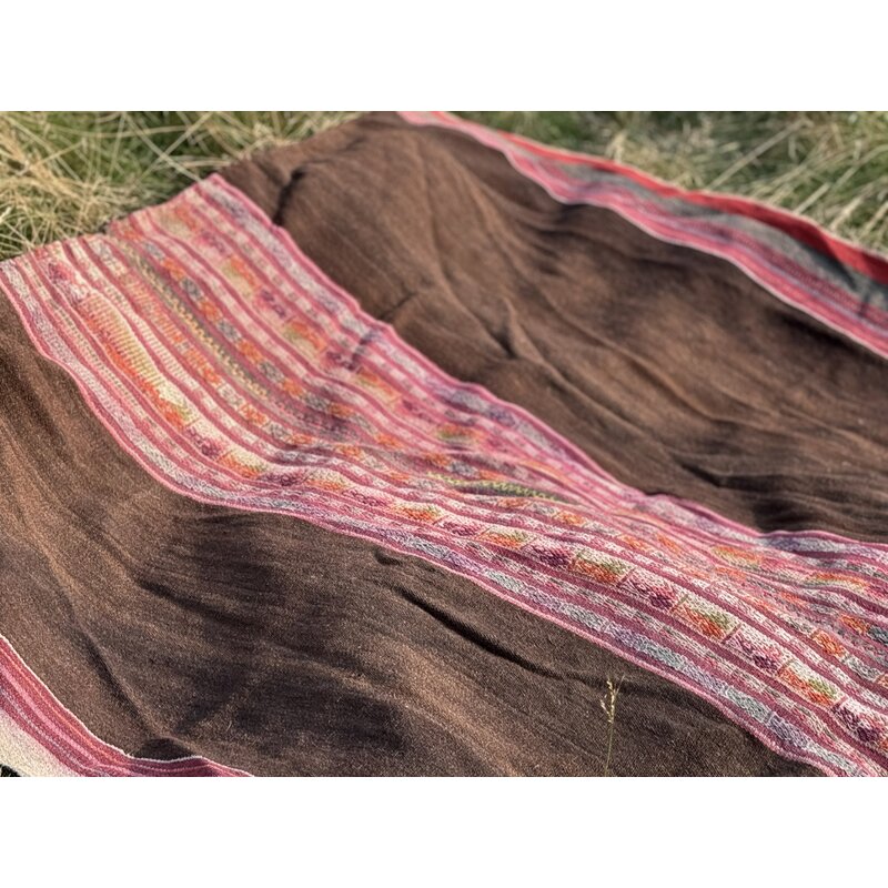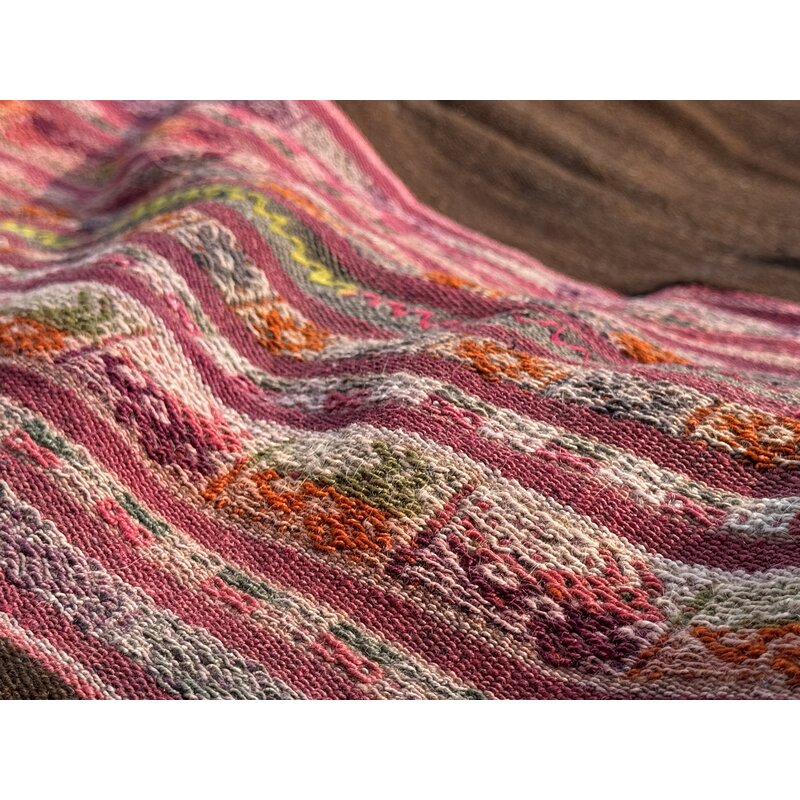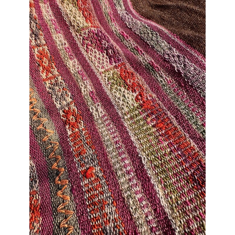Het fijne weefwerk, vol met gedetailleerde vormen en symbolen, is traditioneel vakmanschap en komt uit afgelegen bergdorpen van Bolivia en Peru. Dit unieke product is handgemaakt en geverfd met natuurlijke kleurstoffen, gewonnen uit planten en andere natuurlijke materialen. De schapenwol en alpacawol komt van eigen dieren; de maker is namelijk de boer of boerin zelf. Deze doek is gebruikt, maar heeft toch geen noemenswaardige gebruikssporen zoals vlekken en gaatjes: een heel gaaf exemplaar! Dat versterkt hun karakter en maakt hun uitstraling nog krachtiger.