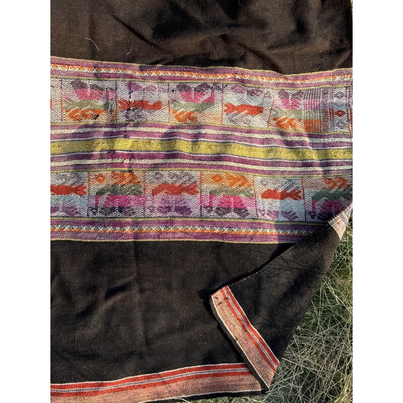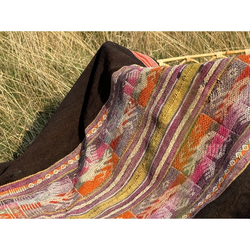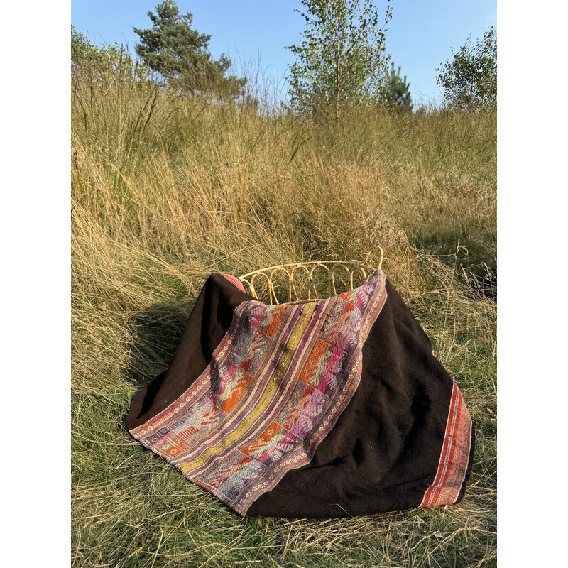 Het fijne weefwerk, vol met gedetailleerde vormen en symbolen, is traditioneel vakmanschap en komt uit afgelegen bergdorpen van Bolivia en Peru. Dit unieke product is handgemaakt en geverfd met natuurlijke kleurstoffen, gewonnen uit planten en andere natuurlijke materialen. De schapenwol komt van eigen dieren en de maker is namelijk de boer of boerin zelf. De doek is gebruikt en heeft een paar kleine gaatjes. Dat versterkt z'n karakter en maakt de uitstraling nog levendiger en krachtiger. Deze doek staat in het teken van het symbolische totemdier de condor, verbinder tussen hemel en aarde, brenger van inzicht en krachtig symbool van de oneindige cirkel van het leven en de dood.