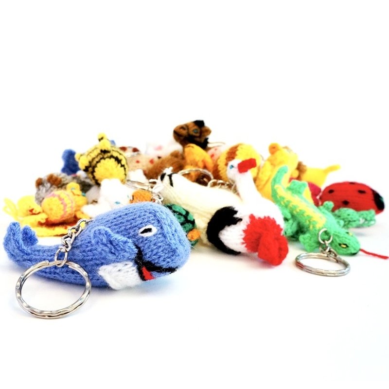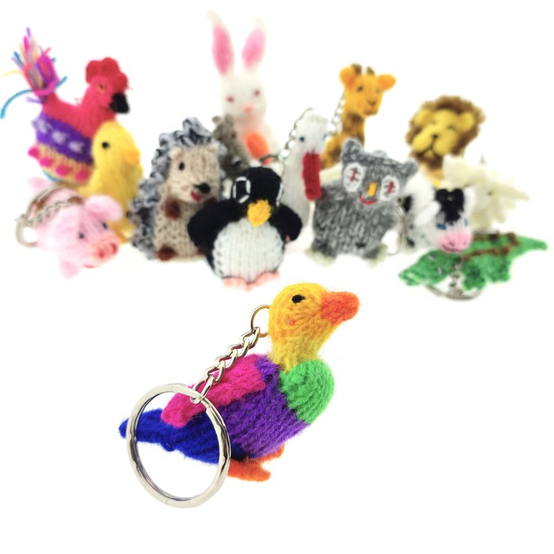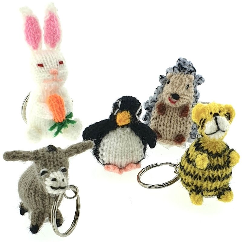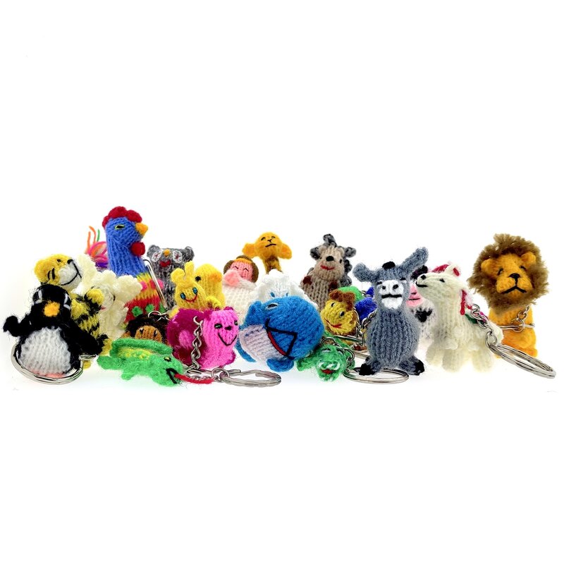 Bont assortiment van gedetailleerd gebreide dieren, voorzien van een stevige sleutelring. Degelijk en ludiek tegelijk; prachtig handwerk! Al ons breiwerk is in handen van toegewijde breisters. De meesten doen het breien naast hun dagelijkse bezigheden. Zo zijn er huisvrouwen met verloren uurtjes, boerinnen buiten het drukke zaai- en oogstseizoen en herderinnen die tijdens het hoeden van de schapen en lama's wel een leeuwtje kunnen breien. De poppen zorgen voor een welkome aanvulling op hun inkomens.